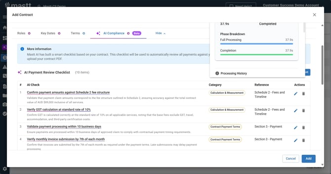 Configure your contracts in Mastt to automatically generate payment certificates, schedules, and recommendations. You can use AI to extract contract details from PDFs or enter information manually for complete control.