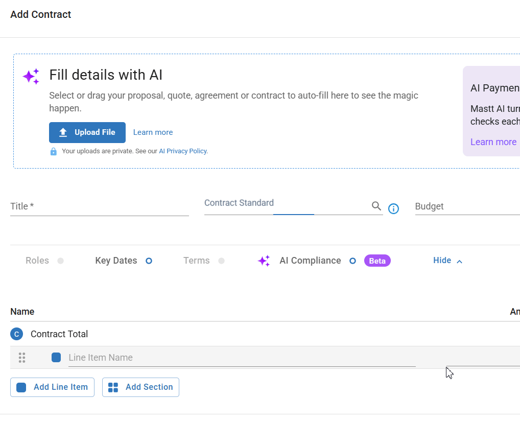 • Set Up Contract via AI Upload – fastest method if you have a PDF of your Contract. AI fills in your contract details and flags important clauses to track.