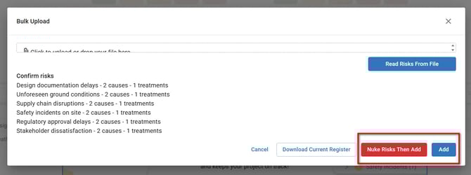 Warning: Nuke Risk Then Add permanently deletes all current risks before importing. Download your current risk register as a backup first if there's anything you want to preserve.