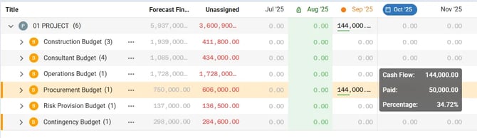 Most teams use both methods: they forecast future months manually, then let paid payments automatically populate actuals as the project progresses.