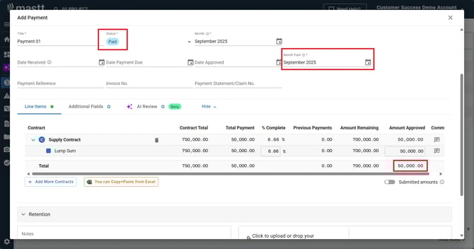 Payments and Cash Flow are directly connected in Mastt. When you mark a payment as Paid and assign it to a month, it automatically appears in your Cash Flow view. This integration eliminates double-entry and ensures your forecasts reflect actual payment activity.