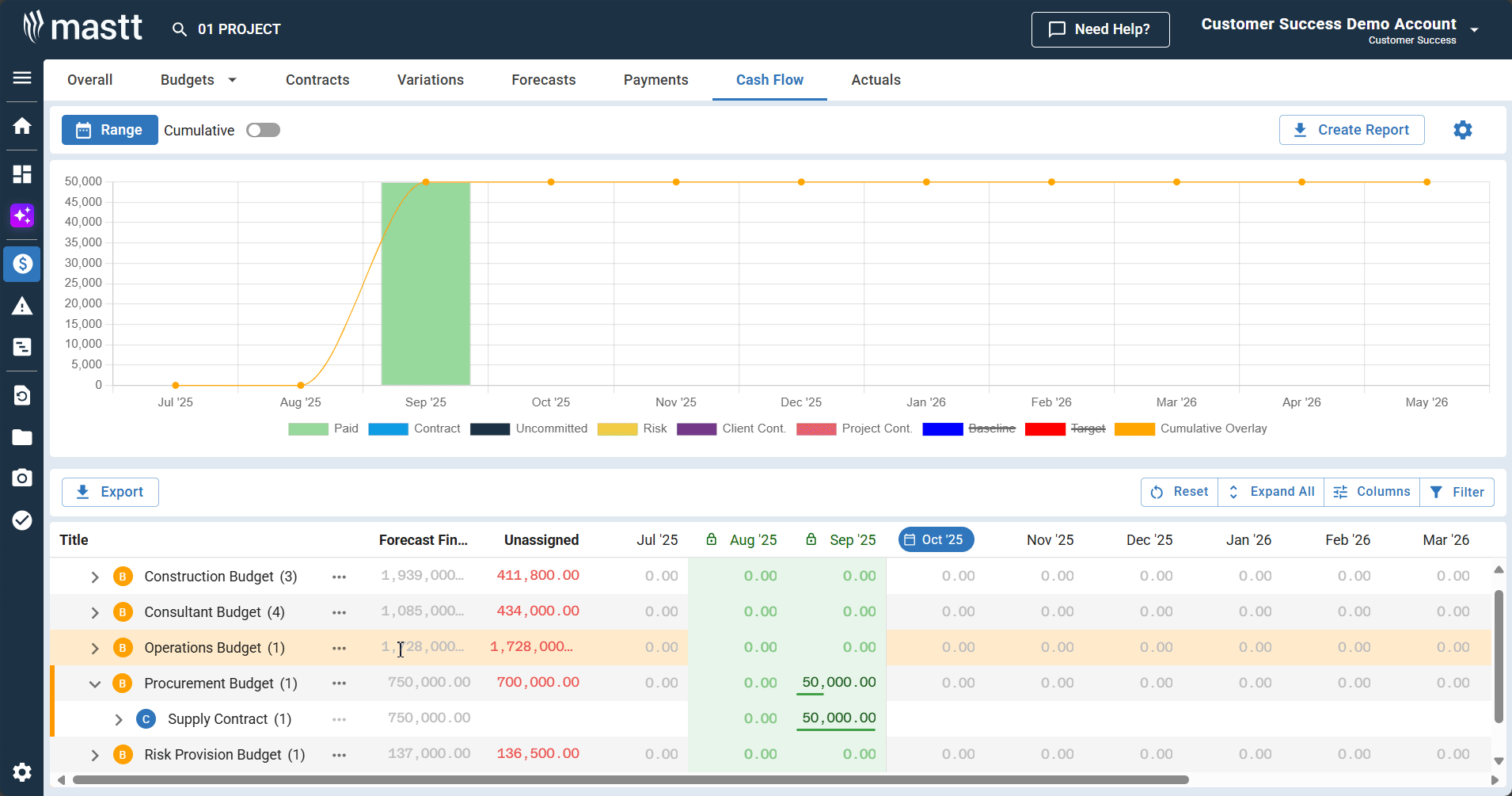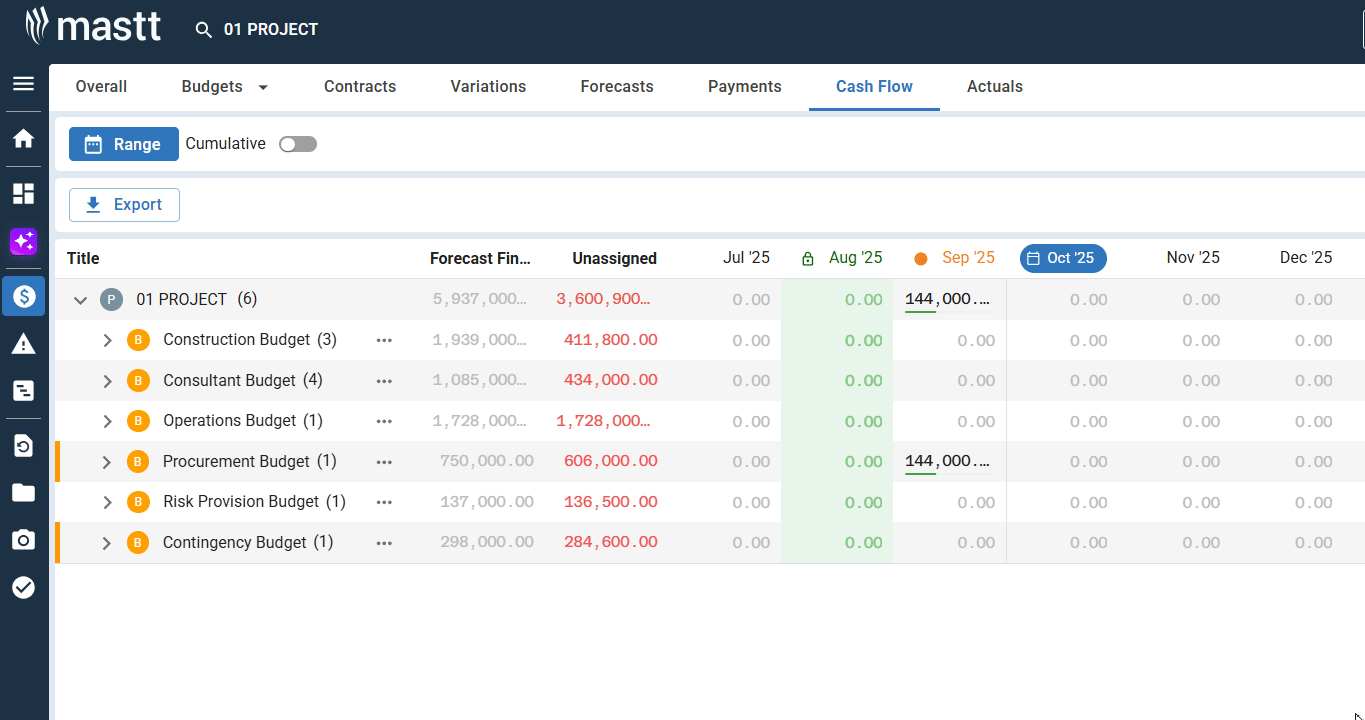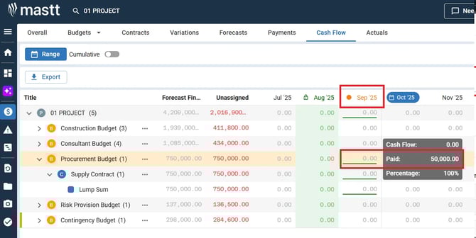 You can enter projected amounts directly into Cash Flow before recording any actual payments. This is useful for planning ahead or budgeting future periods. As you record actual paid payments later, Mastt compares those actuals against your forecasts.