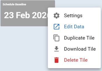 Click Duplicate Tile to create a copy with identical settings. Change the metric on the duplicate to quickly create a set of related schedule tiles (e.g., Current Phase, Planned Completion Date, and Delay from Baseline displayed together).