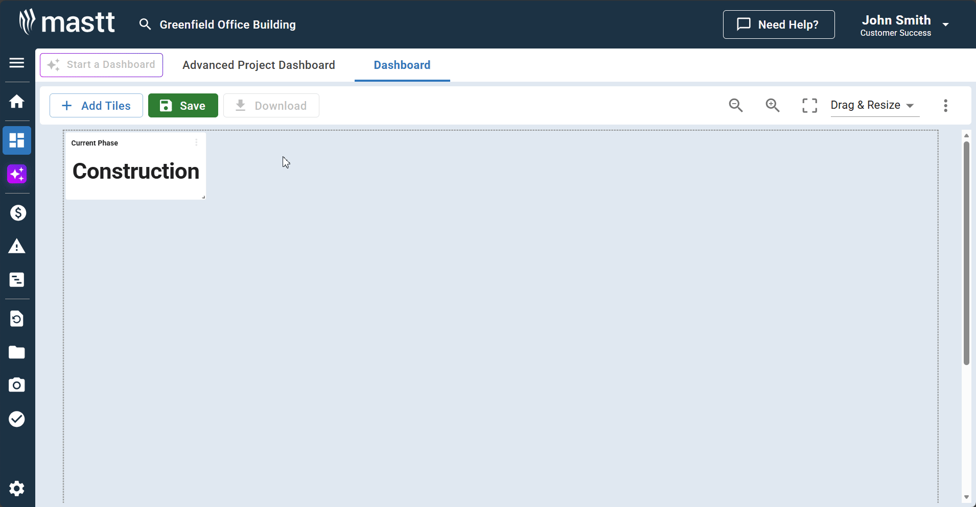 Schedule Metric tiles give you instant visibility into critical schedule information directly on your Dashboard. Use them to display your current project phase, planned completion date, baseline completion date, or how many days your project is delayed. These tiles complement your cost data by showing schedule health at a glance.