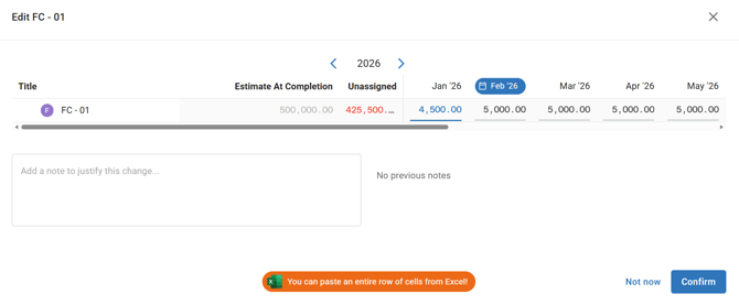 - Paste from Excel: Copy a single row of monthly values from Excel, click the first month field in Mastt, and paste—values automatically populate across subsequent months