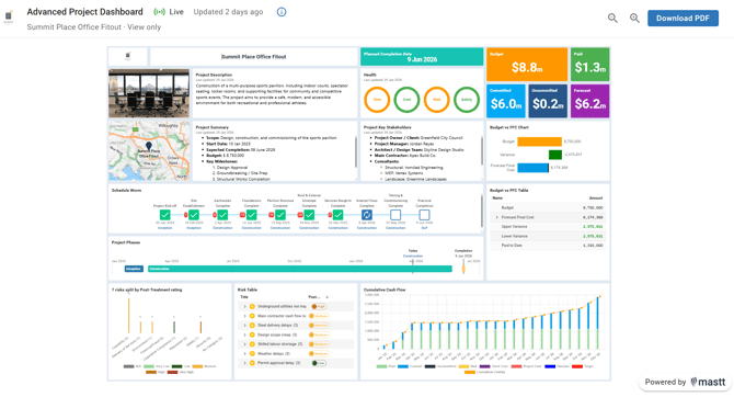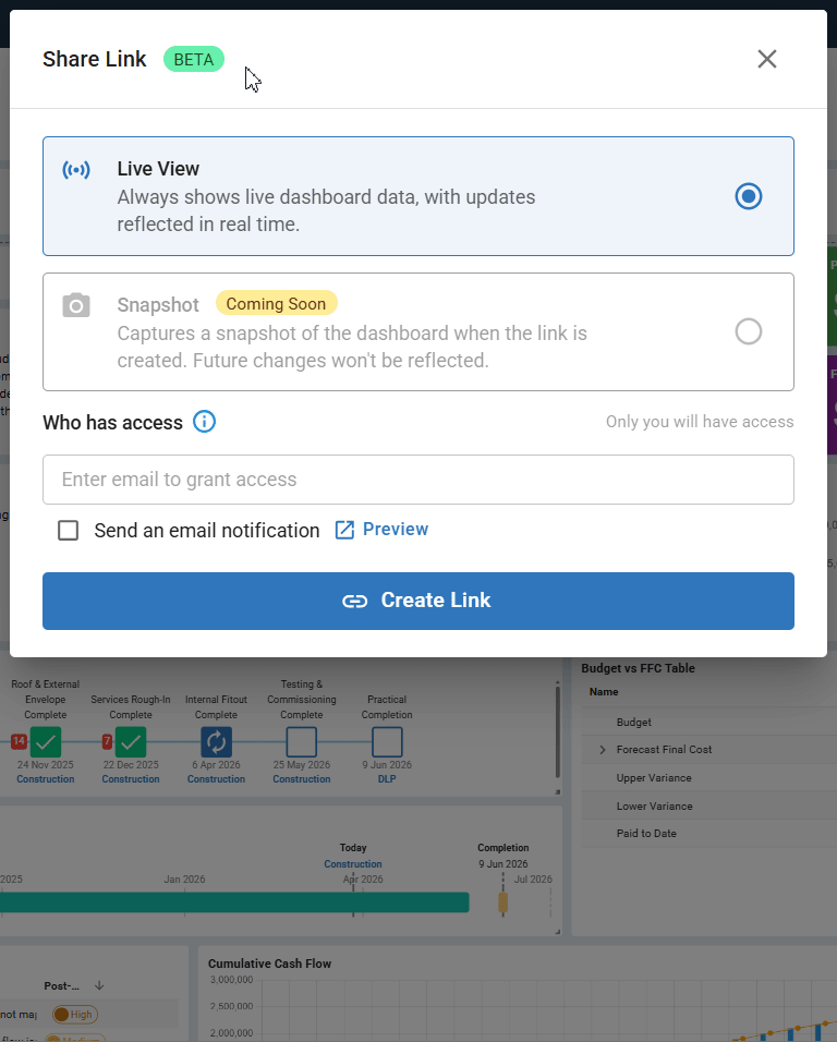 Dashboard link sharing lets you give stakeholders visibility into project progress without granting full project access. Use share links to distribute live dashboard data to clients, asset owners, or team members who need to monitor progress but don't need editing permissions.