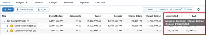 Important: EAC is dynamic and changes throughout the project as contracts, change orders, and forecasts are added or updated. It's a calculated field that updates automatically - you cannot edit EAC directly.