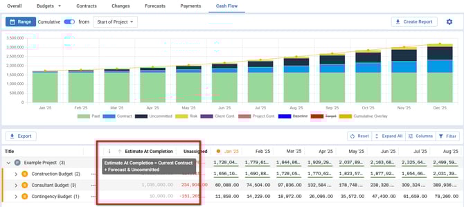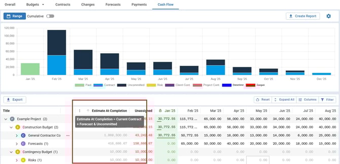 - Navigate to the Cash Flow module to view EAC distributed across monthly periods