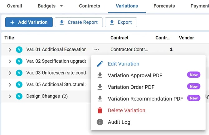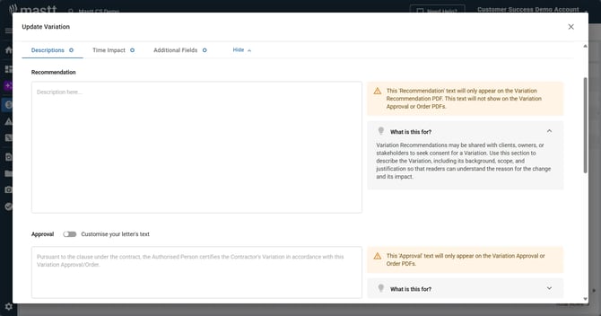 Variation letters provide formal documentation for changes to your project scope and cost. This guide shows you how to download Recommendation, Approval, and Order letters, add custom text, and control who authorises them.