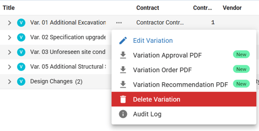 Important: You cannot delete variations linked to payment claims. If the Delete option is greyed out, check for associated payments and delete those first.