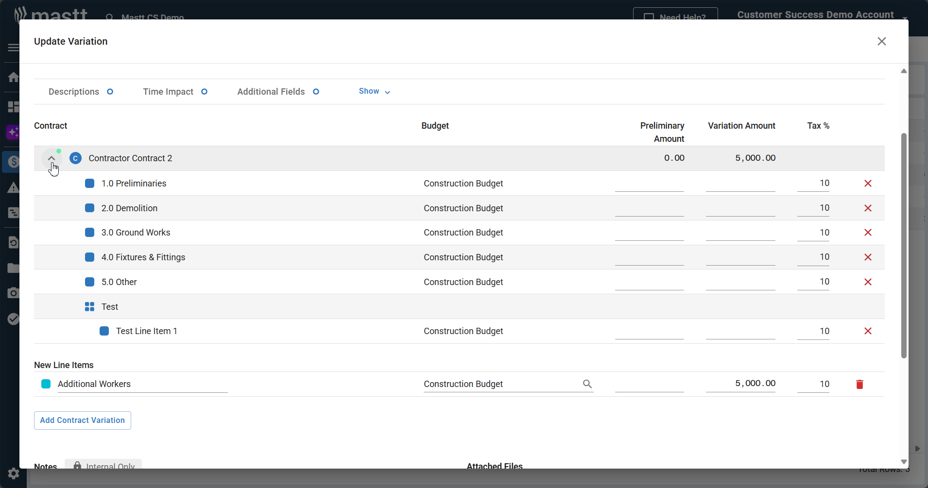 This guide shows you how to update existing variations and permanently remove variations when they're no longer needed. You can edit variation details, update contract line items, add new line items, and delete variations from your project.