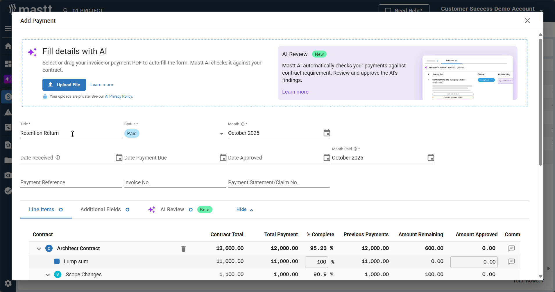 - Enter a negative amount to represent the retention being returned (e.g., -5000 to return $5,000 in retention)